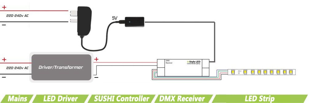 Led led led led led r r c g g w. Multiple decoders can be wired to a single power source given the load of the decoders does not exceed the load of the transformer. If you require more than 30 drivers a splitter is required for additional 30 drivers. When working with a lighting console whether its a pc based or hardware the console will come with a dmx outputa dmx output sends out a signal to communicate with lighting fixtures. 24dmx5m led strip wiring diagram 24 ledm 120 led per 5m reel. Star wiring is only allowed in conjunction with an opto splitter.