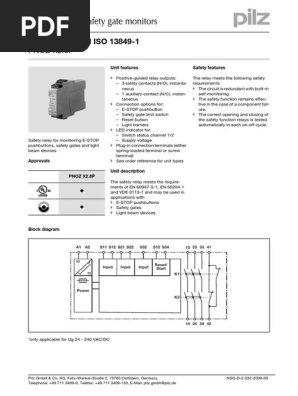 Pilzgmbh at pilzde up to pl e of en iso 13849 1 pnoz x23p nsg d 2 242 2009 09 terminal configuration klemenbgu installation montagepnozxthe safety relay should be installed in a control cabinet with a protec. 49 711 3409 133 e mail. 225 mm integral screw terminals monitoring e stop safety gates. Use one pnoz x per safety function. The technical features are based on voltage free electromechanical contacts with 2 relay technology. 24 240 v acdc.