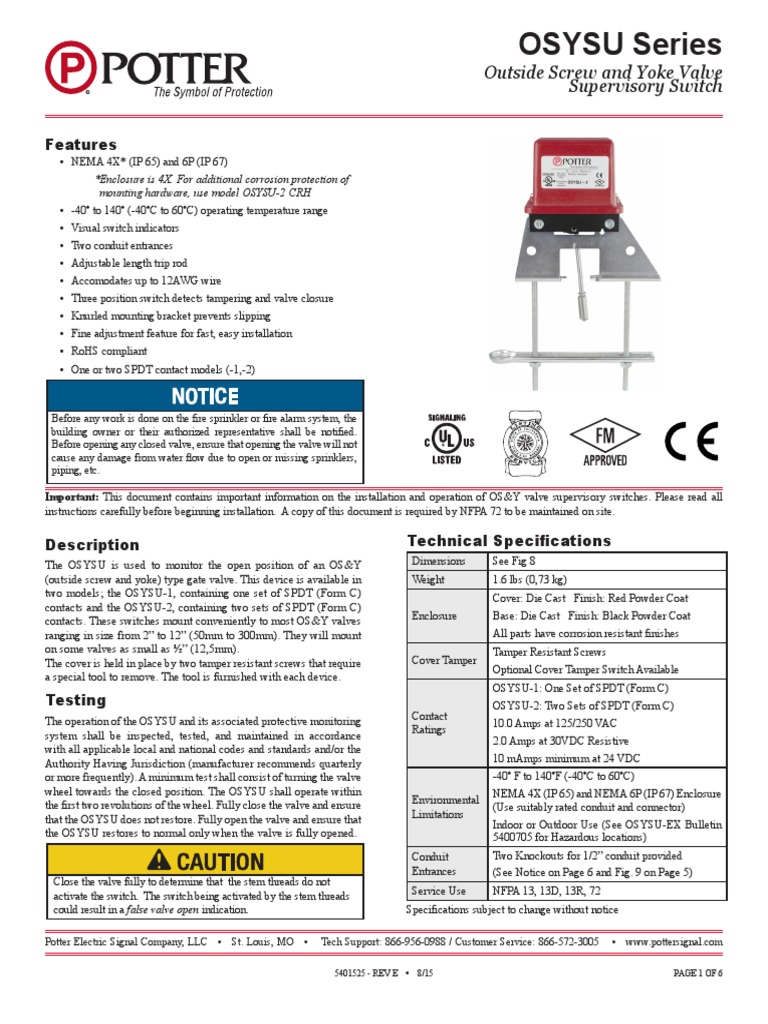 Supervisory switches are not a substitute for insurance. This device is available in two models. The osysu 1 containing one set of spdt form c contacts and the osysu 2 containing two sets of spdt form c contacts. Potter osysu 1 installation on osy fire sprinkler valve duration. Lpc approved sizes are 2 thru 8 50 mm thru 200 mm. 785192000556 also known as.