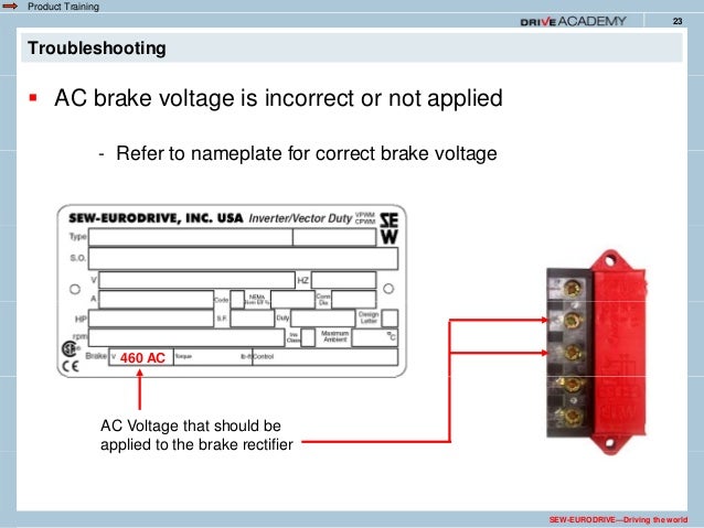 An sew brake rectifier controls both coils. It functions like the rectifier type bge however it is designed to be mounted in a control panel on din rail and not in the motors conduit box. 232 basic functions in contrast to other disc brakes with a dc coil the sew brakes operate with a two coil system. The brake will release and allow the motor to rotate when the nameplate ac brake voltage v b is supplied to the brake rectifier terminals. Product training 23 troubleshooting. The bme brake rectifier is a half wave rectifier with overvoltage protection elements and electronic control for reducing the brake release reaction times.