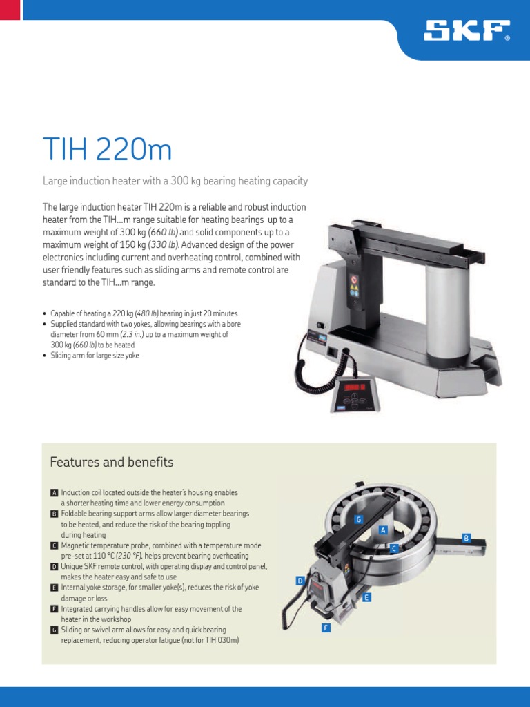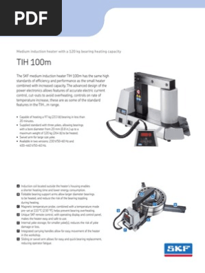 The skf m20 value indicates the weight kg of the heaviest skf spherical roller bearing of series 231 that can be heated from 20 to 110 c 68 to 230 f in 20 minutes. 8 skf tih 100m 13 distinguishing features remote control panel to improve the ease of use and to help reduce the risk of contact with the hot bearing during operation the tih 100m heater is supplied with a remote control panel which can be detached from the heater.